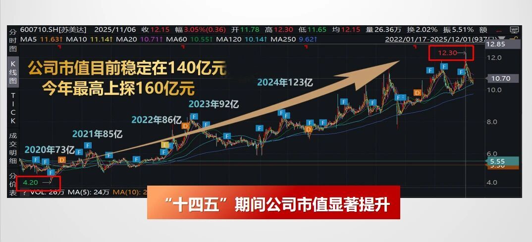 作为江苏资本市场的年度盛会,本届峰会以“向新求质,行稳致远”为核心导向,通过盈利能力、业务增长、治理水平等多维度量化评审,从全省700余家A股上市公司中遴选出数家标杆企业。近年来,苏美达市值呈现稳健增长态势,目前公司总市值稳定在140亿元左右,年内最高上探160亿元,较“十四五”初期实现显著跃升。
