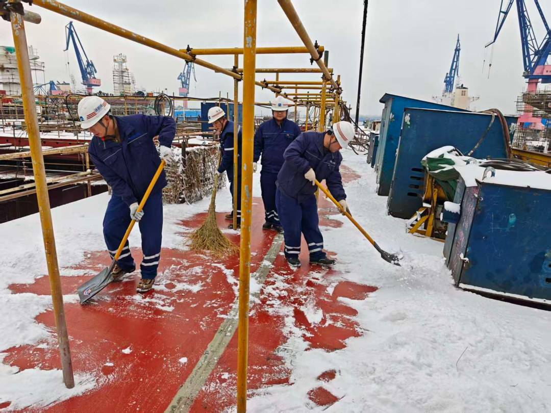 一场瑞雪为新大洋造船厂区披上银装。在作业区域、甲板通道等关键点位,大家挥舞工具清雪,保障生产有序进行。