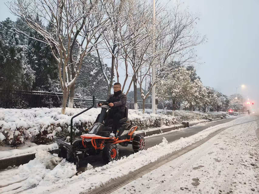 五金公司员工驾驶自主品牌YARDFORCE扫雪机,在厂区外的市政道路上清除积雪,为行人开辟安全通道。