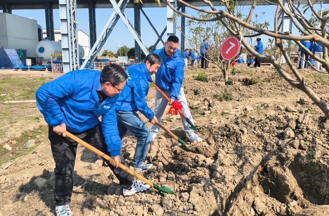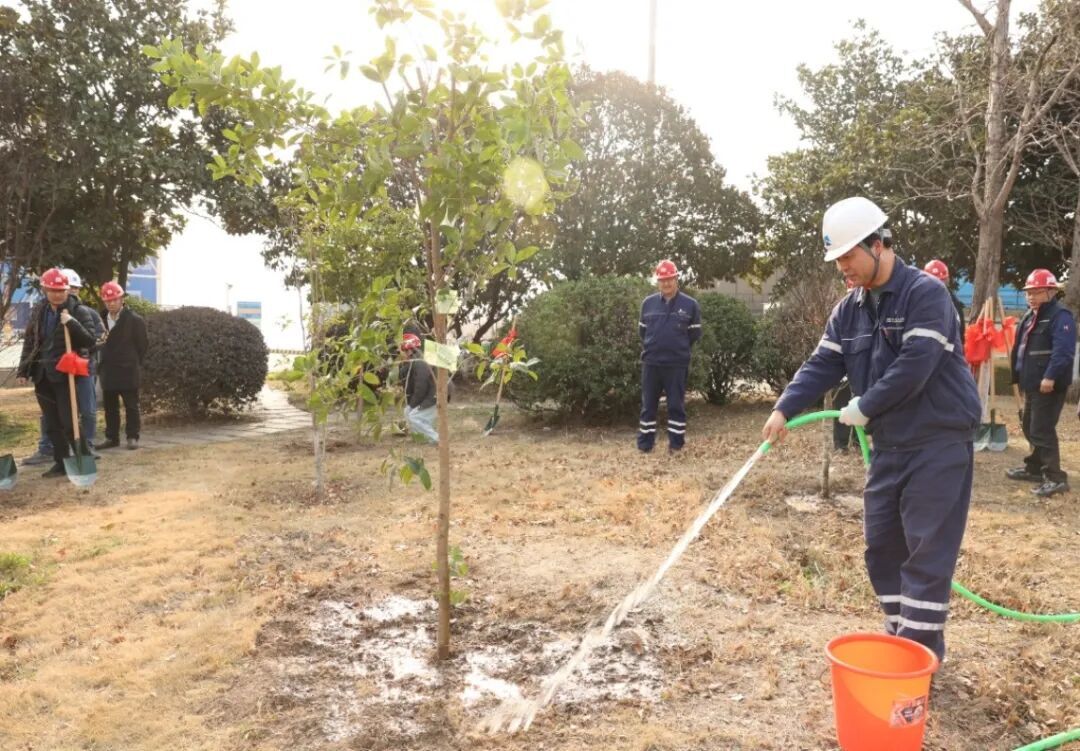 船舶公司在新大洋造船厂区开展植树活动,挥锹铲土、扶苗培土、提水灌溉,一棵棵绿树迎风挺立。
