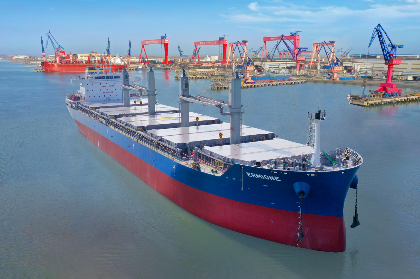 “ERMIONE”号是船舶公司为希腊BMC航运建造的该系列同型船第3艘。该船型优化浅吃水设计、提供尽可能大载重量,具备满足最新环保法规、更低燃油消耗、配备克令吊提供自装卸能力等优势,为客户提供具有竞争力的运输解决方案。