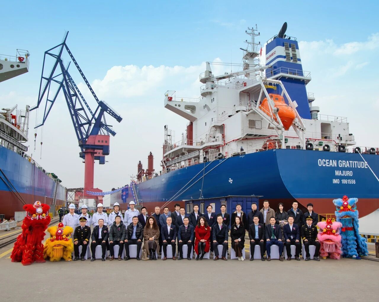 3月5日,苏美达股份有限公司(以下简称苏美达)所属船舶公司为华夏金租建造的首艘皇冠63 3.0版本散货船“OCEAN GRATITUDE”命名仪式顺利举行,完成马年首船交付。华夏金租总裁沈宗庆,劳氏大中华区高级顾问薛茂根;苏美达党委委员、副总经理,船舶公司董事长何隽及项目各方业务人员出席命名仪式。